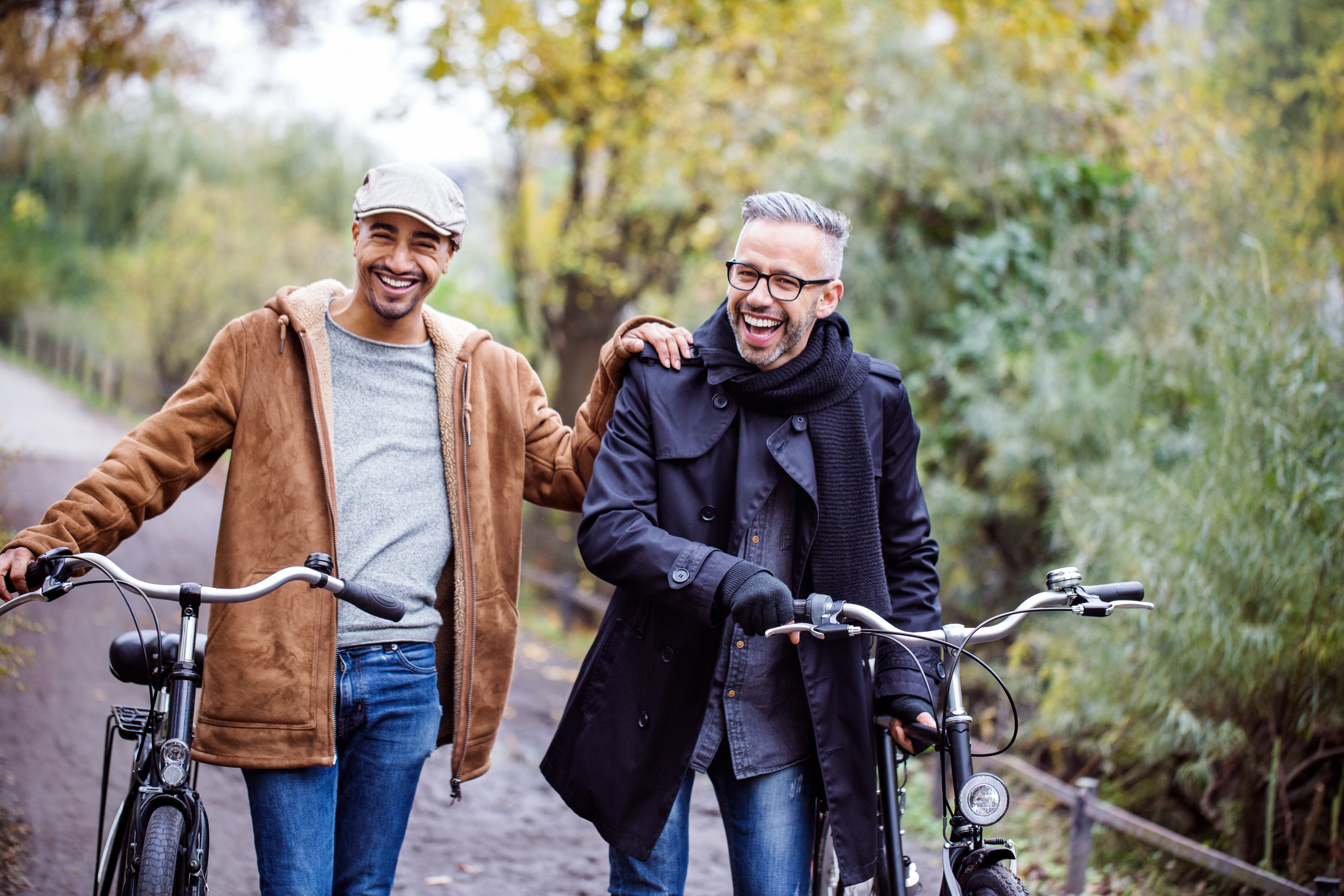 Leende man och kvinna står utomhus vid en cykel och tittar tillsammans på en mobiltelefon